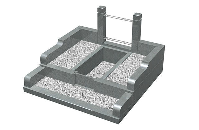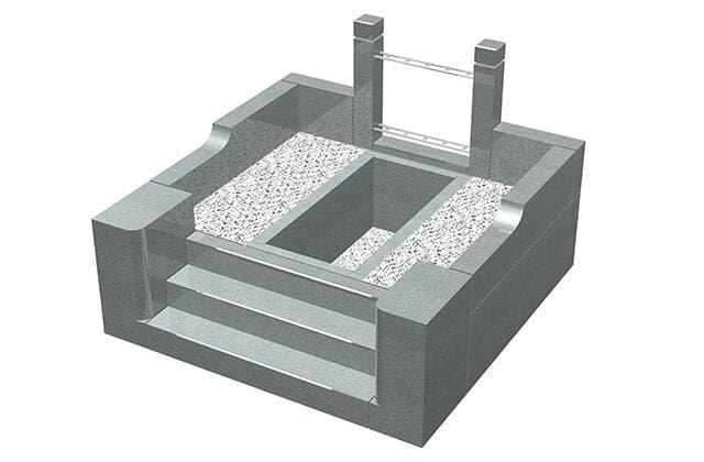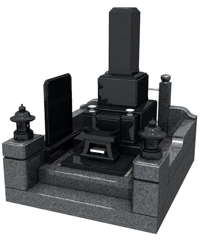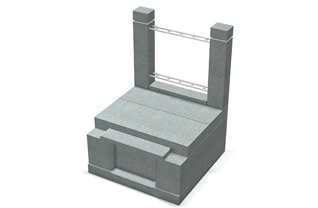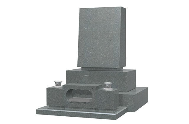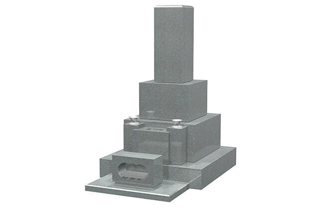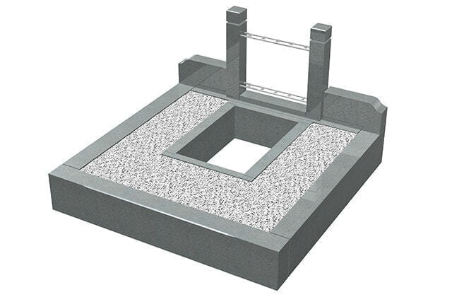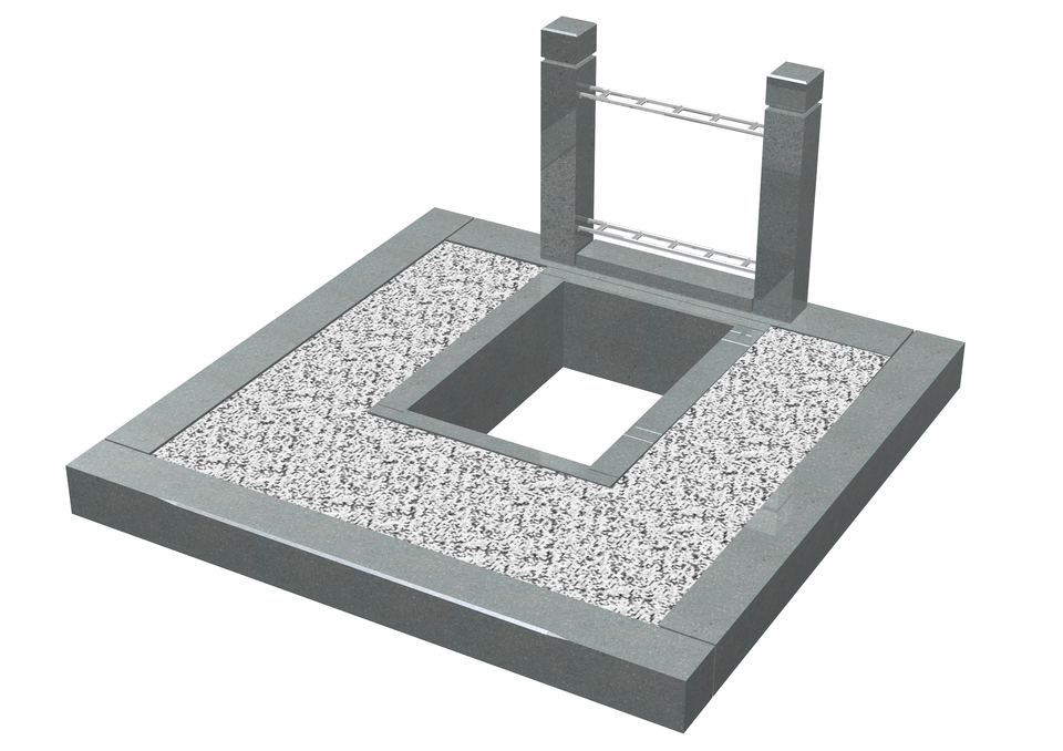墓所四方に石で囲いをめぐらせただけの外柵。段差が高いので墓所内に入ってお参りはできないが、シンプルな設計から施工費が低廉です。奥行140cm以上の墓所に設置する場合は手前を低くし墓所内に入りやすくする必要があります。